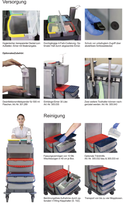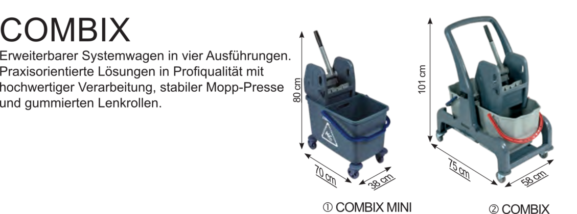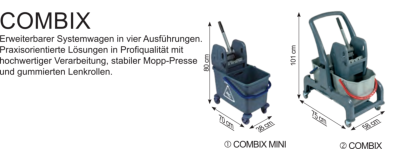 Verschließbarer Reinigungswagen in zwei Ausführungen.Der Matrix, wahlweise mit Mopp-Presse oder Mopp-Boxen, besticht durch perfekte Verarbeitung, eine äußerst solide und robuste Bauweise, sowie ein hervorragendes Preis-Leistungs-Verhältnis.Der extra große Innenraum verfügt über drei ausziehbare Wannen und ein Ablagegitter und bietet vielseitigen Stauraum für die Aufbewahrung von Reinigungsmittel oder andere Utensilien. Die abschließbare Türe gewährleistet maximale Sicherheit im Objekt und garantiert jederzeit ein modernes und dezentes Erscheinungsbild. Dank der großen gummierten 100 mm Lenkrollen, lässt sich der Matrix auch bei voller Ladung jederzeit mühelos und sicher bewegen. Die	hinteren Lenkrollen verfügen über zwei einzeln arretierbare Feststellbremsen und sichern den Matrix beim Abstellen vor ungewolltem Wegrollen.